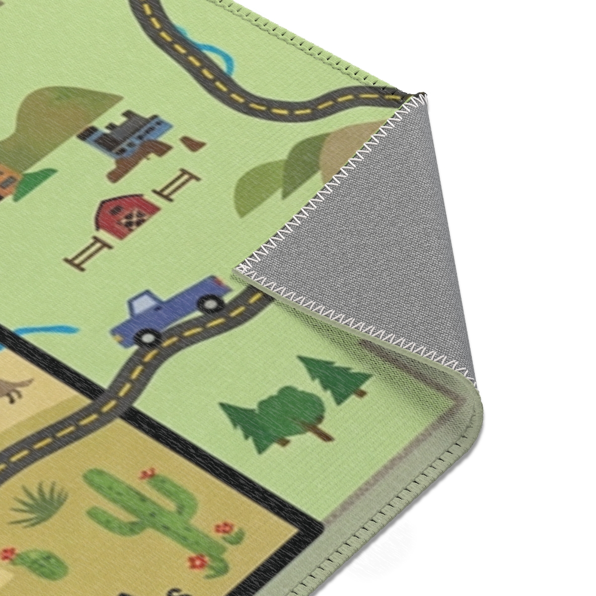 Here's what our customers receive: vibrant, high-quality play mats printed on soft chenille rugs that kids love.